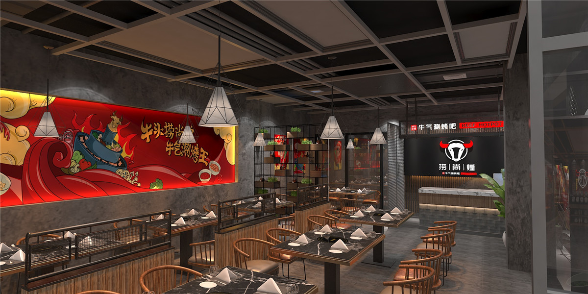 案例介紹:撈尚煌,特色涮烤吧連鎖品牌,項目從設(shè)計到施工到落歷時2個月,以深灰色為主色調(diào),工業(yè)與現(xiàn)代元素融合,為夜餐生活創(chuàng)造獨特氛圍。